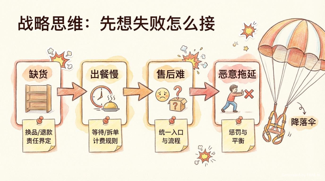 战略型产品经理不仅要设计“一切顺利”的流程,更要提前想到所有可能出错的地方,并设计好兜底方案。