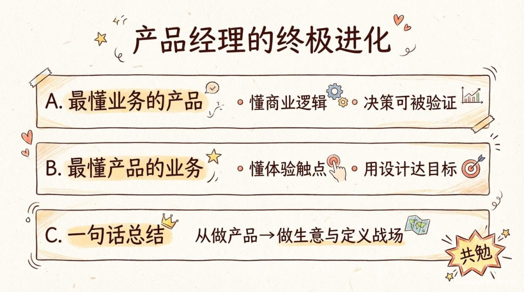 - “最懂产品的业务”,意味着你不能只会看数据、谈战略,你必须深入产品细节,理解用户体验的每一个触点,知道如何通过产品设计来实现商业目标。