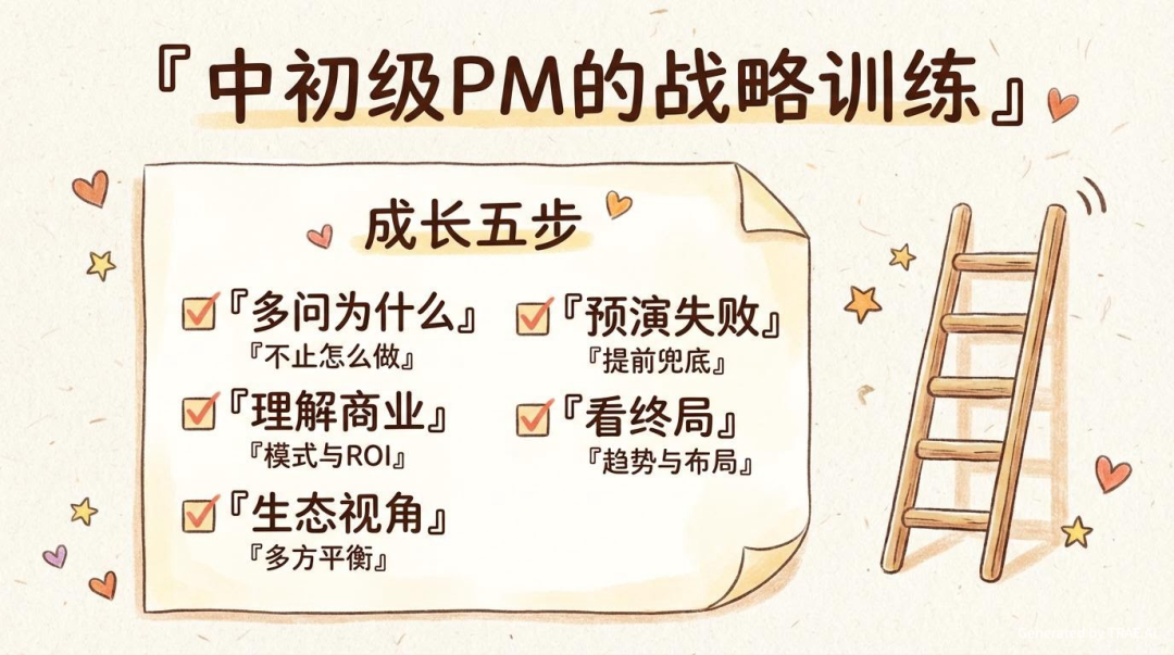如果你现在还在第一层或第二层,不要着急。每个顶级产品经理都是从画原型、写 PRD 开始的。但你可以有意识地培养战略思维: