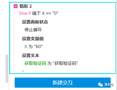 - 在情形2下添加动作,设置动态面板停止循环;设置变量X的值为“60”;设置“获取按钮”文本为”获取验证码”。