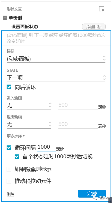 这个办法使用动态面板的状态切换来完成。具体使用了动态面板状态循环切换和动态面板状态改变时的交互。