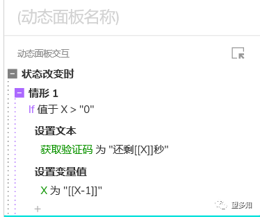 - 选中动态面板,新建交互,状态改变时,设置“获取按钮”文本为“还剩X秒”;设置变量值X的值为X-1.
