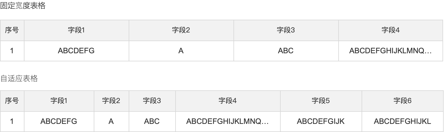 字段展示只列表中的每个字段展示的规则,首先字段的宽度,一般分为固定和自适应宽度。固定宽度指每个字段宽度都时一个固定的值(如果字段过少,不满一屏可等分),自适应宽度,就是字段的宽度根据字段的大小变化而变化,但也哟最大值,一般最大值为15个字符,超过15个字符用…代替。一般不建议数据换行