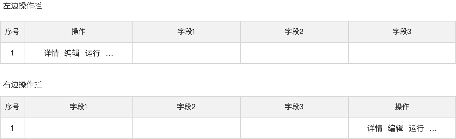 单个操作也叫一对一的操作,对列表中的数据一对一的操作。比如,详情、编辑等。这类的操一般会放在列表操作栏中,操作栏一般放在列表的左边或者右边,如果列表宽度超过一屏,右边的操作栏会采用浮动的样式,操作栏功能按钮一般不超过3个,如果超过采用隐藏的形式