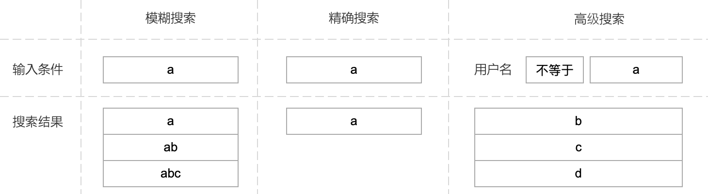 常见的放置位置在是在列表的上方区域,条件搜索分为模糊搜索和精确搜索,模糊搜索,属于包含关系,如,输入“A”,搜索出所有包含”A“的数据;精确搜索,属于等于关系,如,输入”A“,搜索出只有”A”的数据。除了模糊搜索和精确搜索以外还有高级搜索,高级搜索包含了除包含关系和等于关系的其他所有关系,如,不能为空,等于零等。