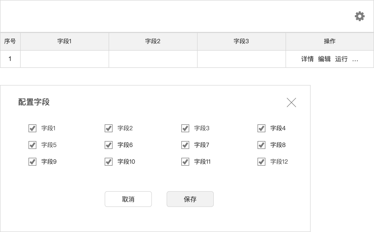 字段配置主要用于一个列表满足不同用户的需求时,对不同用户所关注的数据字段不一样,进行人性化的配置。有字段配置的列表,初始状态有两中表现形式,一种是,默认基本字段,用户增加所需要的字段(做加法);一种是,所有字段都展示,用户减去自己不想要的字段(做减法)。字段配置按钮一般放置在列表右上方。