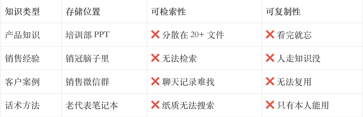 - 产品知识分散在 20 多个 PPT 里,代表找不到、记不住