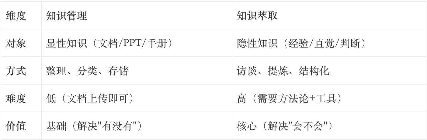 知识管理是”把已有的文档整理好”,知识萃取是”把没有的知识挖出来”。