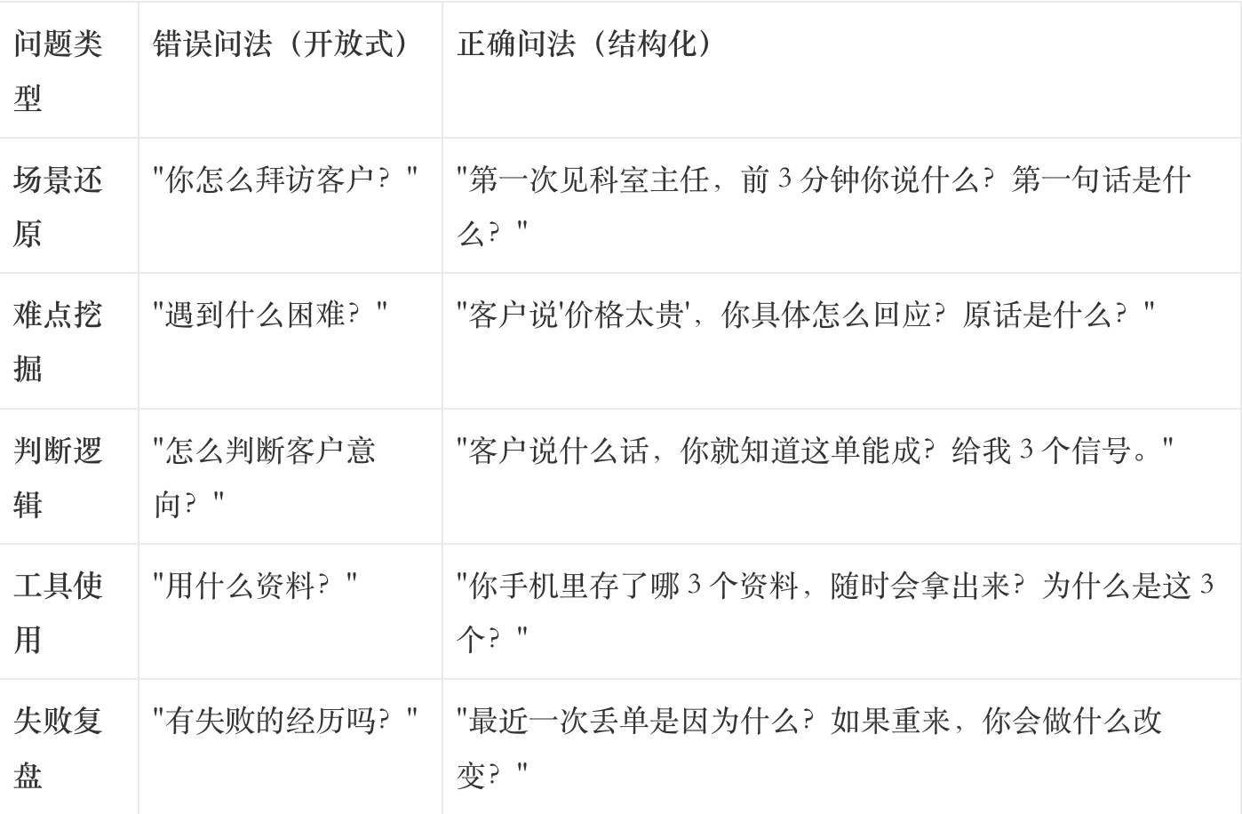 核心原则:不用开放式问题,用结构化问题引导输出。