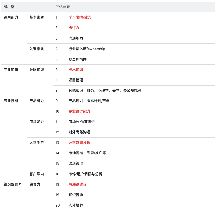 表格里划分通用能力、专业知识、专业技能、组织影响力四个大模块。通用能力是所有产品必备的能力,随着级别的提升,其他模块能力需要随之提升,但后续可能会根据不同的产品方向侧重点不同。