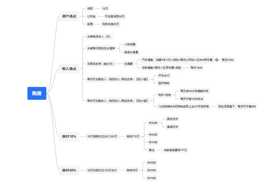 整理当前总现金流,对应首付10%及首付30%得场景,对应得月供,当前得每月可支配收入是否足以覆盖房贷月供