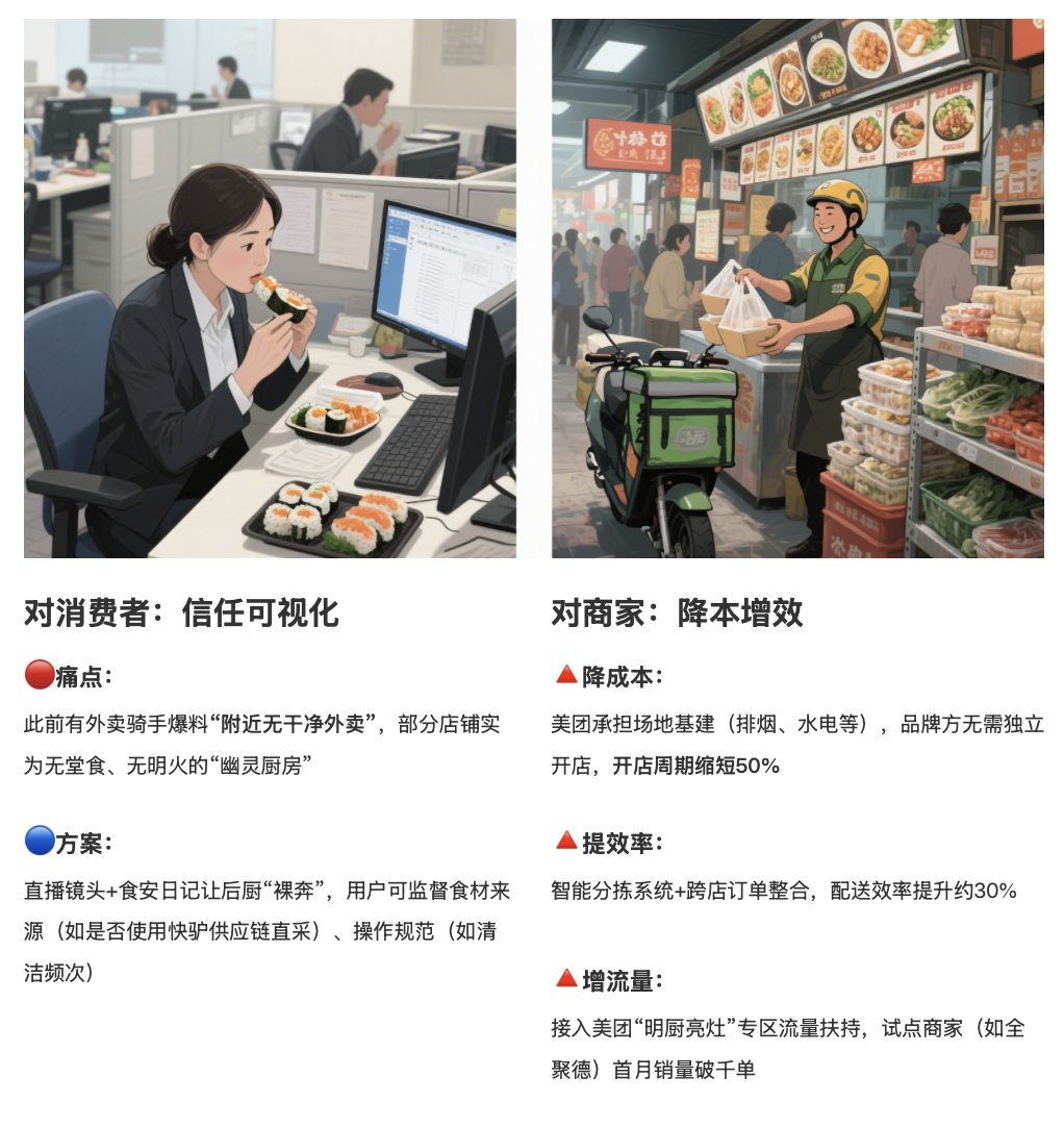 它以“透明厨房+全链条食安管控”为核心,通过重资产投入打造“透明化外卖集合店”直击行业长期存在的食品安全痛点,试图彻底解决外卖行业的信任危机。是美团2025年在外卖增长上,重点探索的第二曲线。