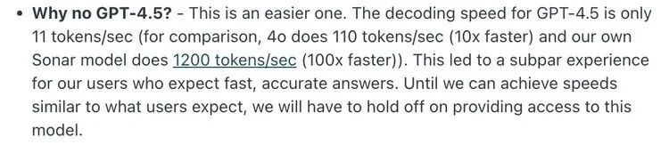 Aravind曾在Reddit上解释为什么没有接入GPT-4.5:“GPT-4.5的解码速度只有11个token/秒,相比之下,4o是110个token/秒(快10倍),我们自己的Sonar模型是1200个token/秒(快100倍)。这导致用户体验不佳,因为他们期望快速、准确的答案。”
