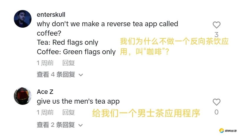 作为“背调男性的App”,Tea一度引起了两性话题的发酵。上个月,TikTok上Tea相关的评论区中,就有不少男性认为,他们应该推出一款男性使用的“Tea”App,对抗女性使用Tea单方面审判男性的局面。