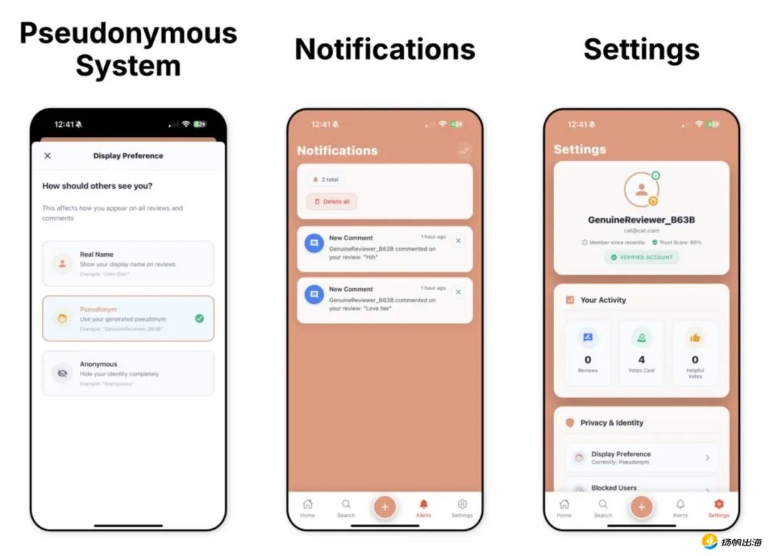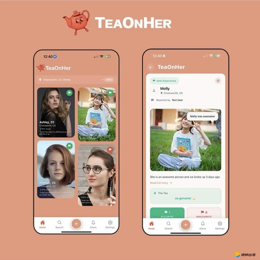 总的来说,TeaOnHer虽然借鉴了Tea的主要模式,但在功能上做了一些简化和差异化设计。Tea提供了电话号码、犯罪记录等查询功能,而TeaOnHer目前并未涉及这些功能,只开通让用户上传自己的约会经历和约会对象信息,识别潜在的危险信号。