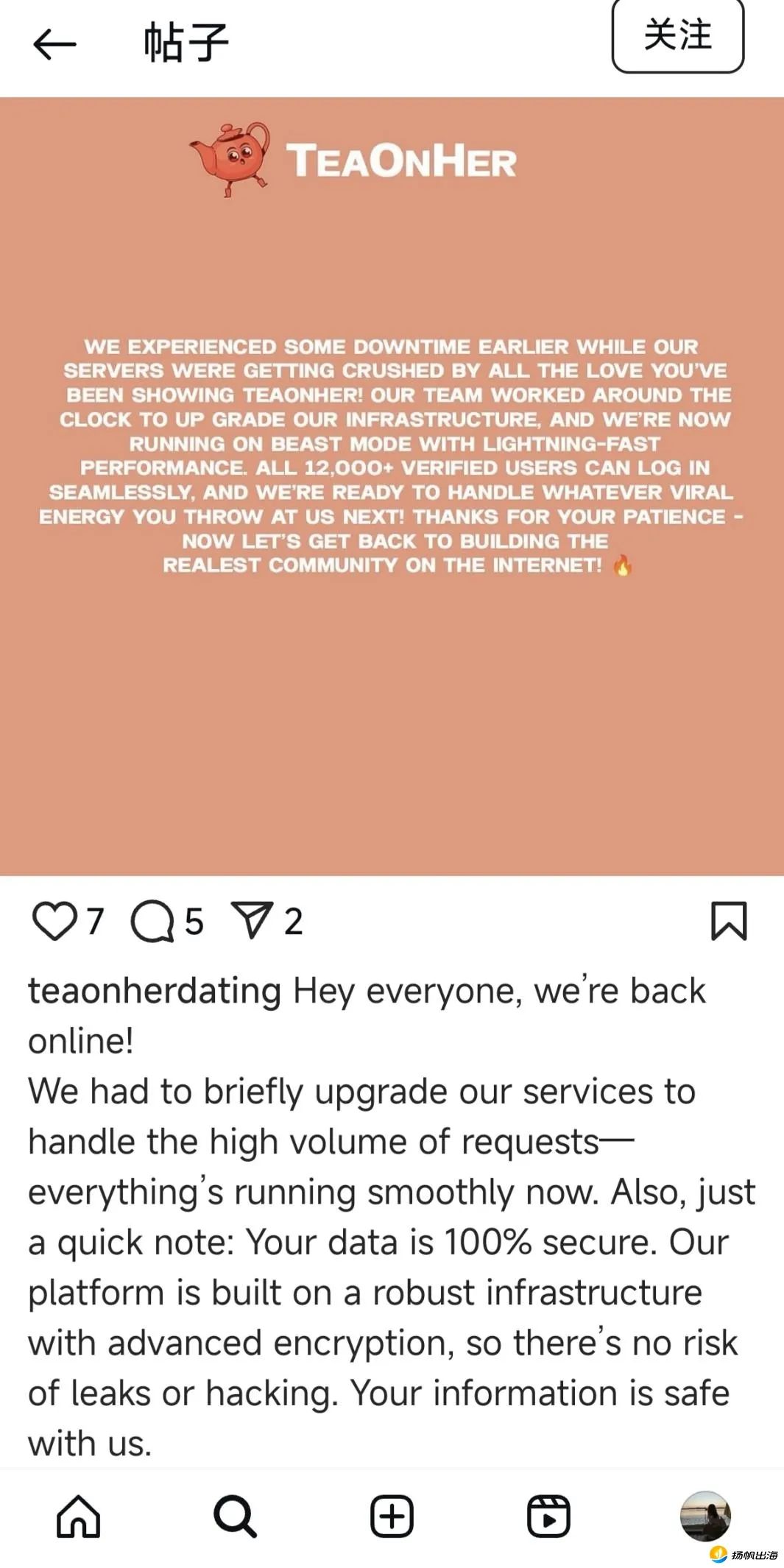 目前,TeaOnHer的用户在应用商店反馈,App存在服务器超时等让用户体验不佳的问题。作为刚上线的产品,TeaOnHer还在持续优化中。其Instagram官方账号今日发布博文,表示应用在简短地升级服务器后又重新上线,所有功能顺利运行,并保证用户数据100%安全。其承诺,平台具有先进的加密技术,(目前)没有泄露或者黑客的风险。