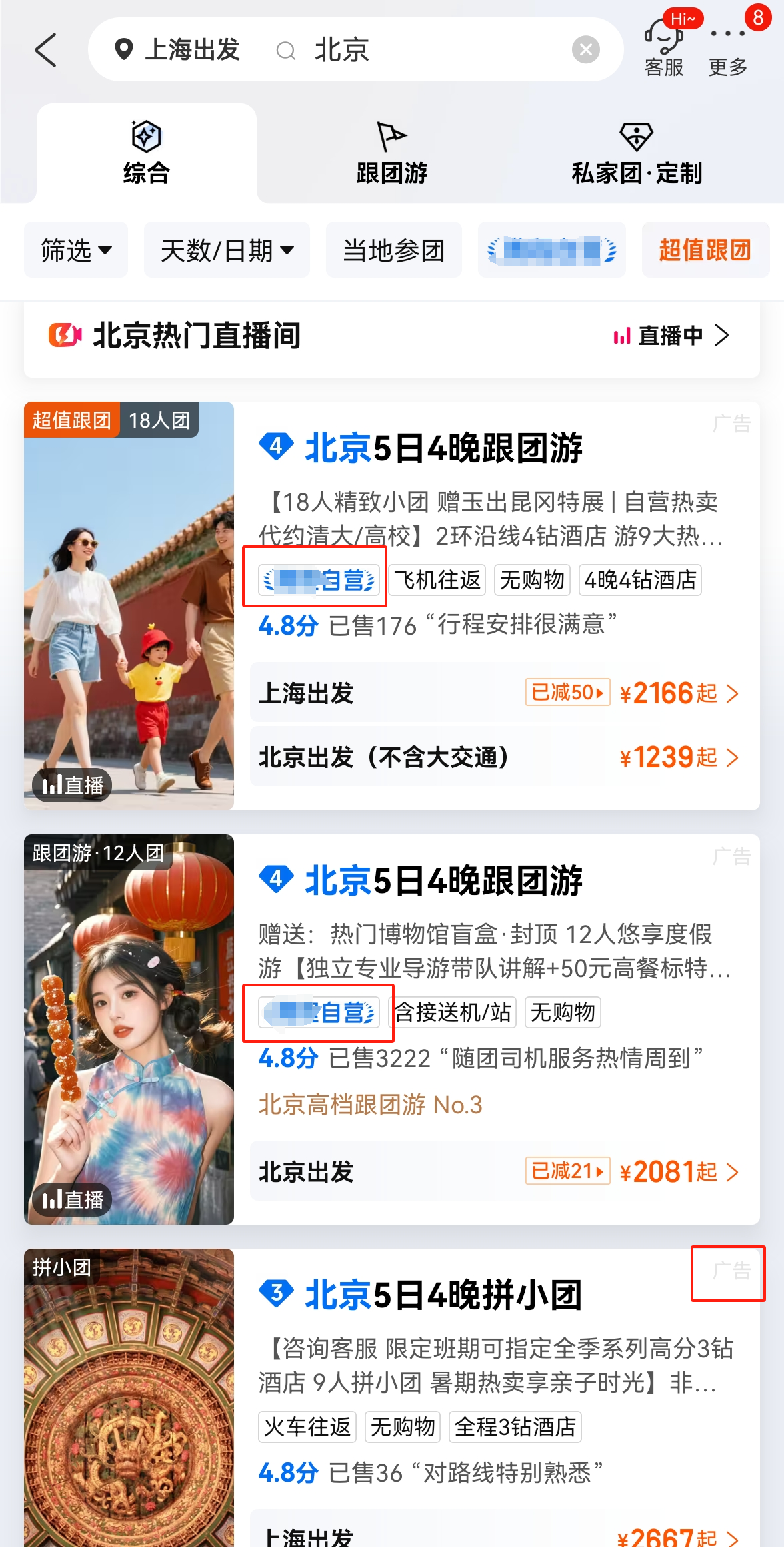 目前点开这家OTA,排名靠前的通常是自营产品。而代理产品,在搜索展示页面下,并不会显示由哪家旅行社提供。