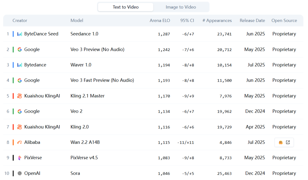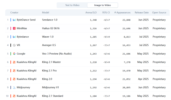 值得一提的是,榜单上除了有阿里、字节等互联网大厂,minimax、爱诗科技等创业公司也赫然在列,且国内厂商的出现率明显略高于国外厂商。