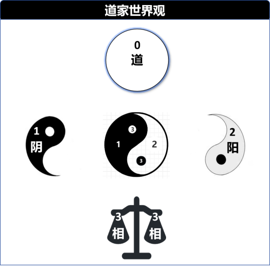 大家对道家思想最熟悉就是这个道家太极图,道虽然看不见也摸不着,却是创始之祖,也是驱动之源,我们用0来表示。1和2代表一体的两面性,例如天地、主客、黑白等,3代表1和2相互作用而产生的万象变化,就是相,这些所有的变化又遵循道的平衡法则,而平衡的法则就是万相要归为0也就是归为道。