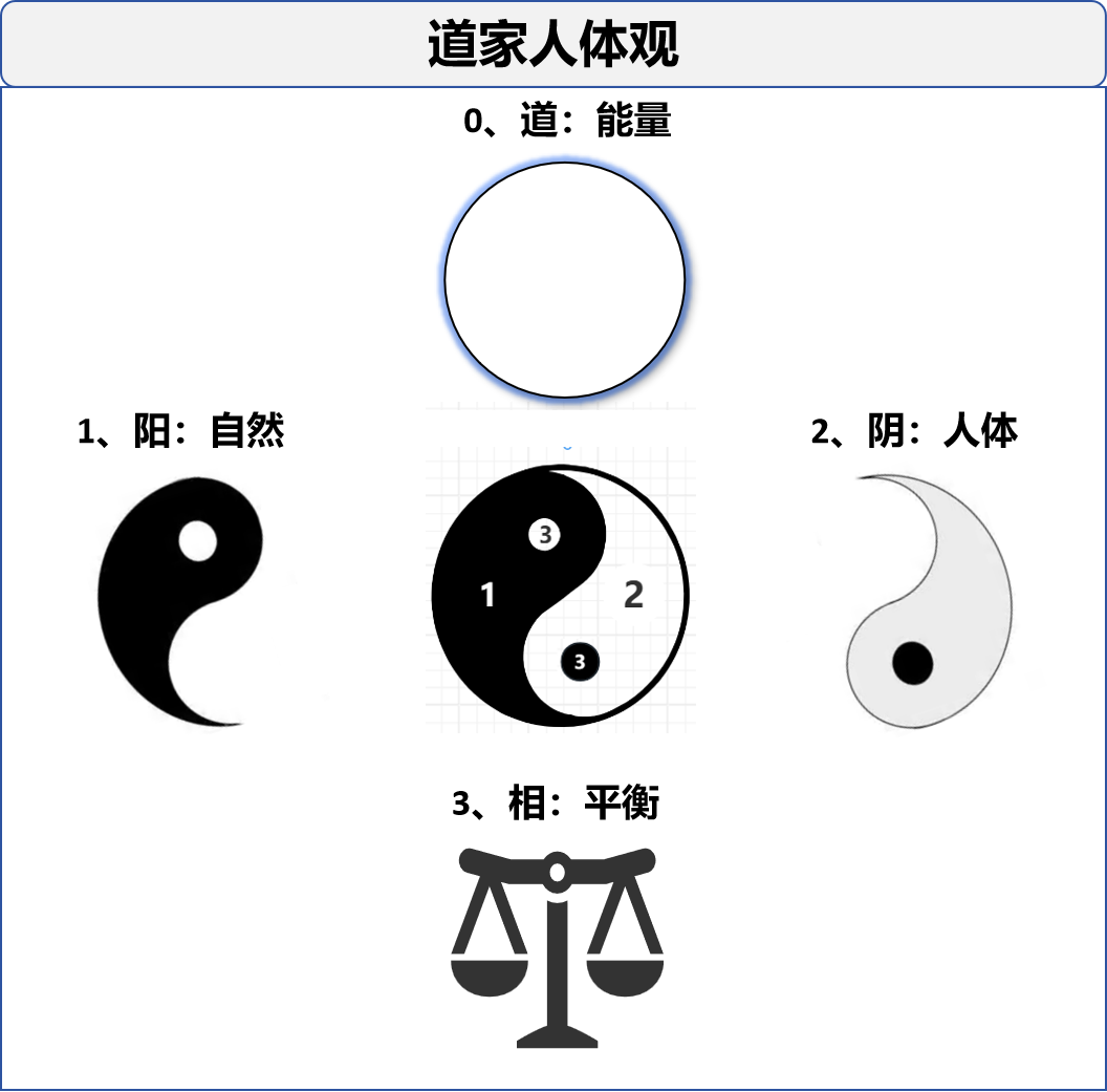 即0代表能量,1阳代表自然物质,2阴代表人的结构空间,3代表人体和自然界的交换、运转、运动或者说叫转化。让我们进一步推敲下:道0通过频率生成了自然界各种万物1,然后1的万物又通过先经后络形成了我们的人体2,然后1的物质在2的人体结构中进进出出,就是我们吃喝拉撒3。