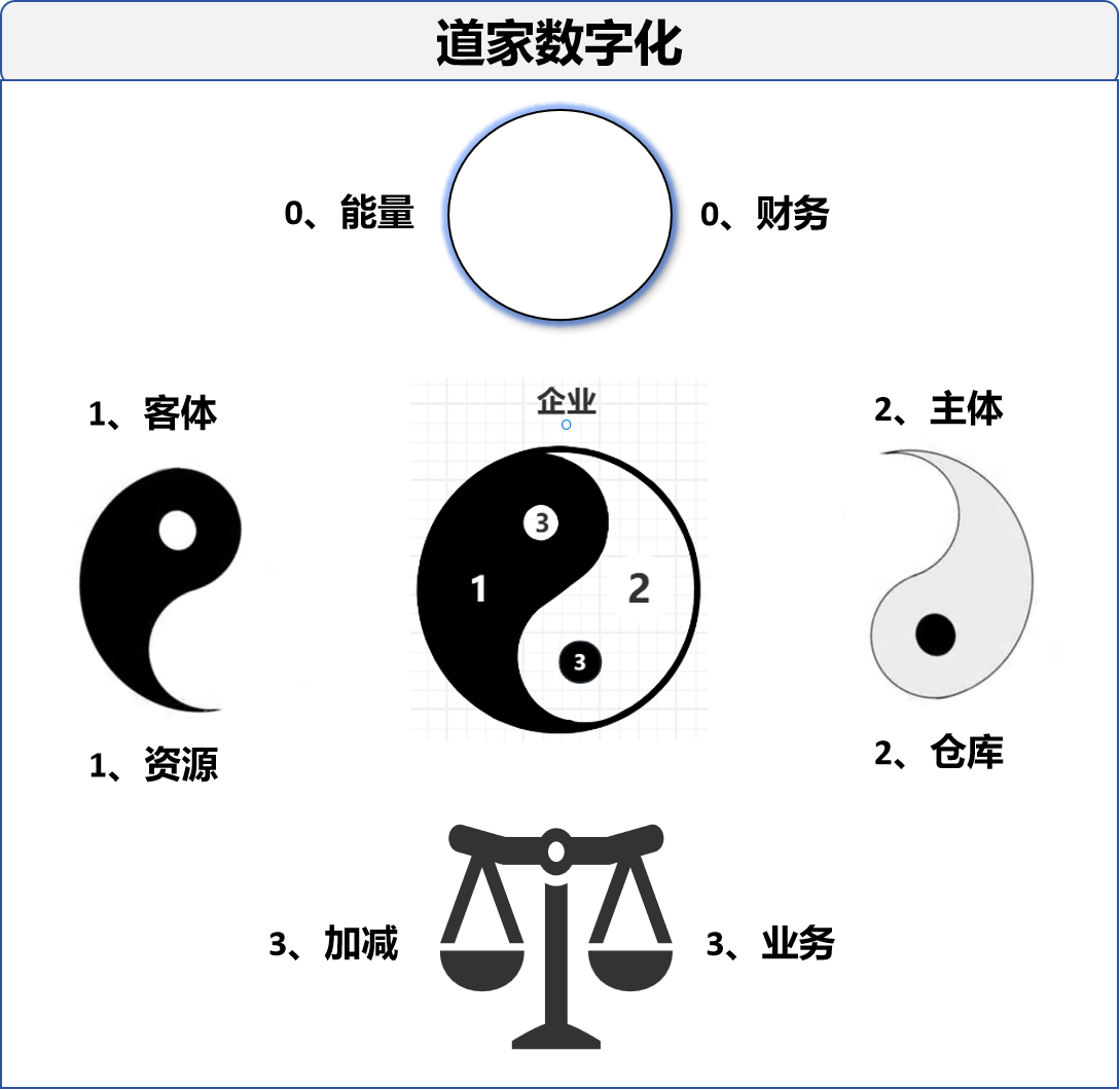 在这个企业数字化构架中,也有道和一二三,这个道可以看做是企业的货币资产,一代表是我们企业管理的客体,即用资金可以买卖所有人机料资源,二代表主体就是企业的组织结构载体,三就是主体和客体不停变化和转化所形成我们的企业经营活动,而推动他们的能量就是财务本身。