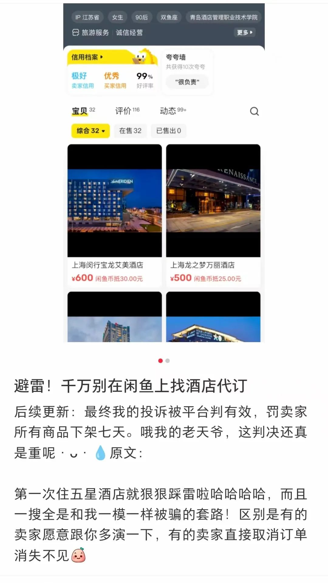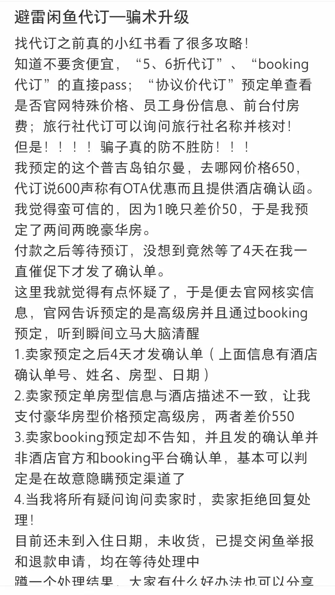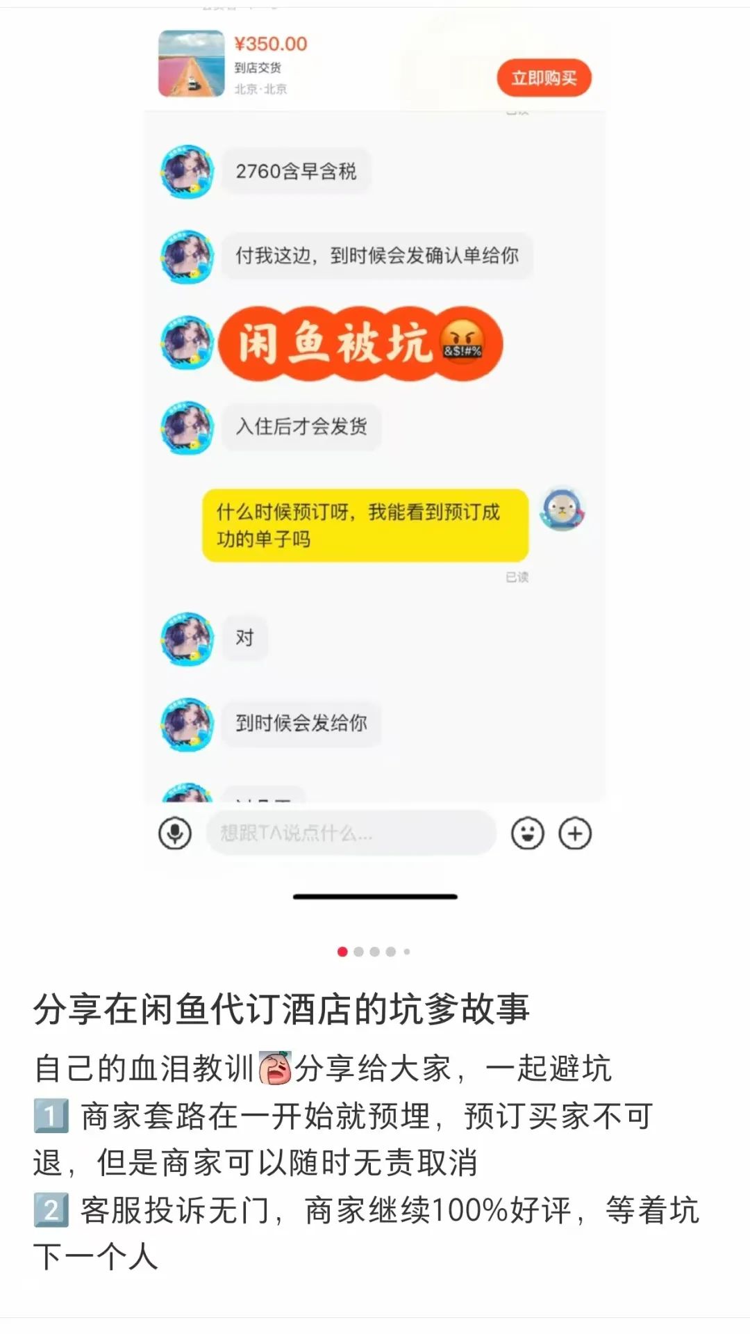 灰色即风险。关于订酒店和门票,我在网上看到很多翻车的例子,因为不靠谱的代订,损失几百甚至几千元。甚至,代订的离谱故事五花八门,几乎可以组成一期“闲鱼版脱口秀大会”。