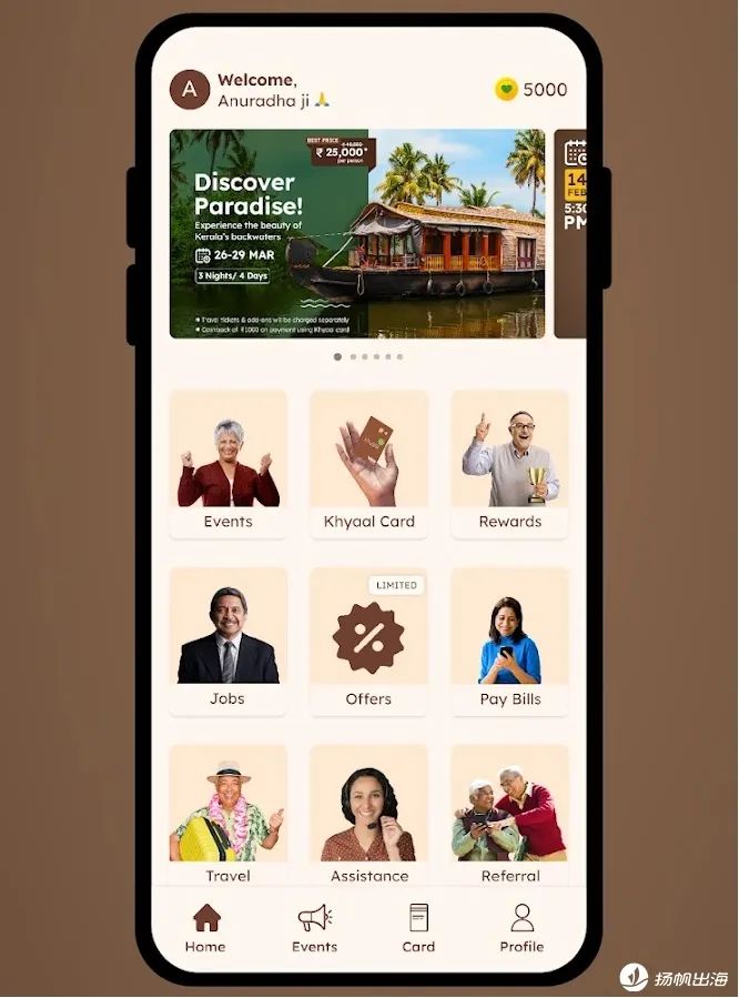 Khyaal由印度本土团队所打造,2020年,其最早作为一个线上社群而诞生,目标群体是50岁以上的银发人群。在随后的5年时间里,Khyaal迎来了快速的增长,截至今年,Khyaal已经完成了从1万到百万的跨越——累计用户超300万,成为印度TOP1银发APP。