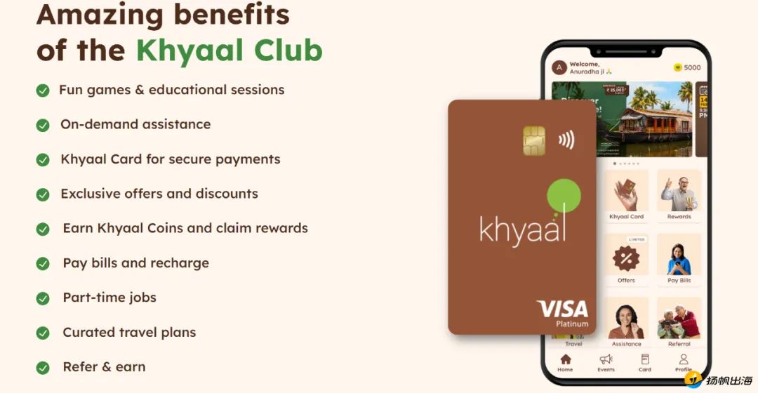金融层面,Khyaal和印度当地大型银行Yes Bank联合推出了印度首张专为老年人而设计的卡片Khyaal Card,这张卡既带有NFC功能,可以与移动设备感应,便于老年人之间互相交换自己的联系方式、爱好等信息,同时也可以存储一些健康信息,如果遇到紧急情况可以立刻让医护人员获取到关键的内容。此外,Khyaal Card还具备支付功能和投资功能,可以作为信用卡在线下使用、通过支付行为赚取金币(类似积分)并在APP上换取奖励。值得一提的是,其投资功能(Digi-Gold)也是基于社群中老年人反馈的需求而新增设的。