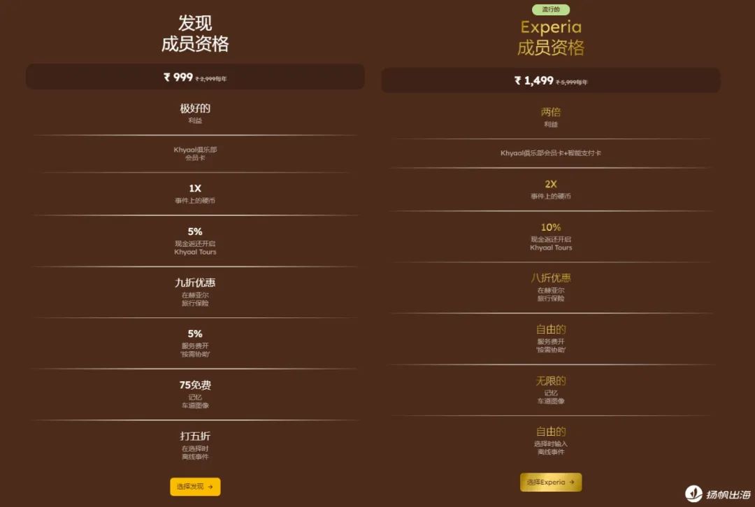 根据官网显示,Khyaal的年费会员有两个档位,一是初级年费会员,价格在999卢比/年,二是高级会员,价格为1499卢比/年。需要注意的是,除了更低的折扣、更高的返利之外,只有成为高级会员才能获取Khyaal Card并使用其支付功能,以及免服务费使用“一键帮助”功能(也就是我们前面提到的线下生活服务)、记忆线玩法(生活记录)和参与离线活动。