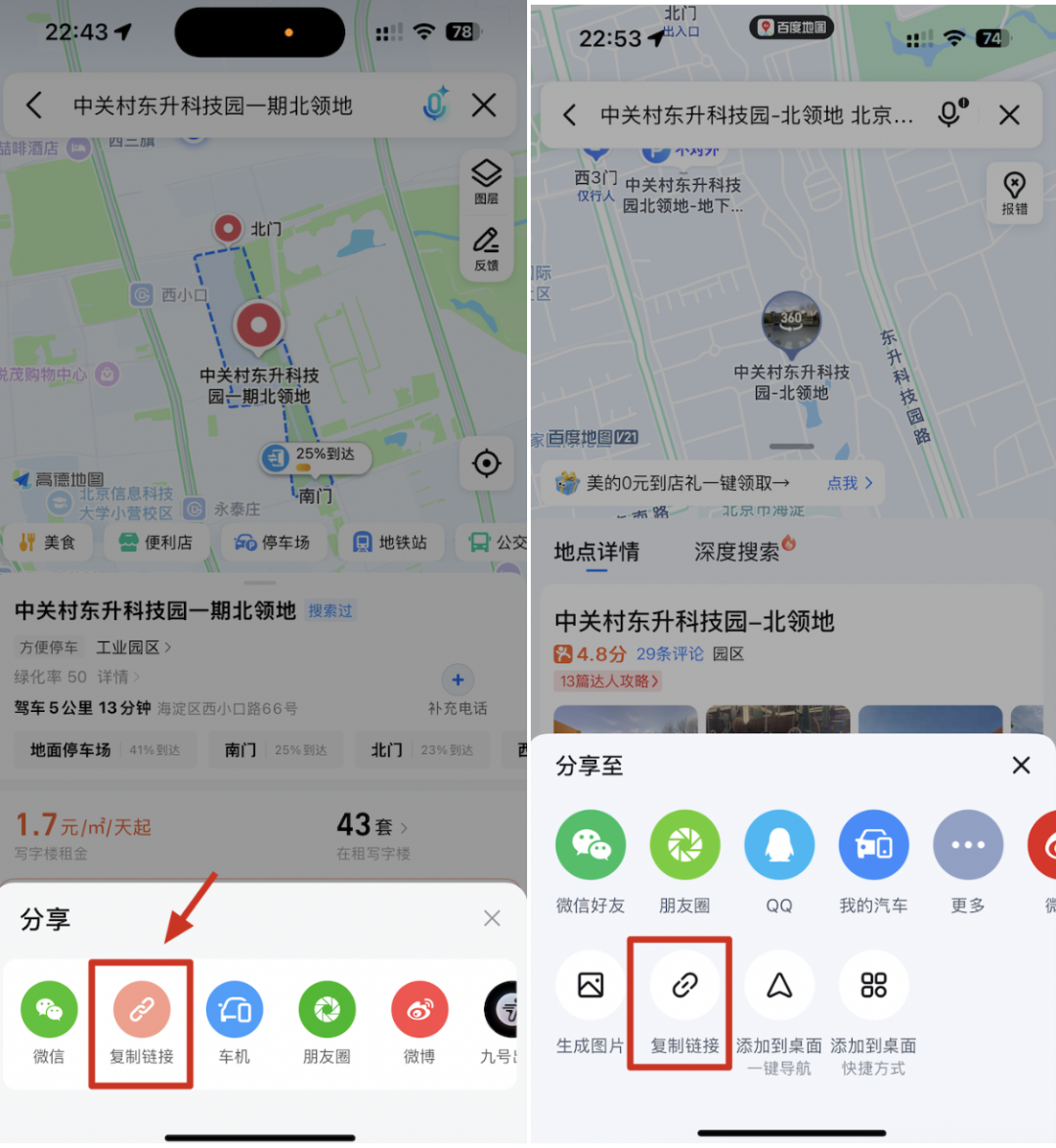 高德地图App和百度地图App,它们的分享都有【复制链接】的能力,我将他们的分享url转为了二维码,自家的扫一扫都是可以识别自家url生成的二维码的。