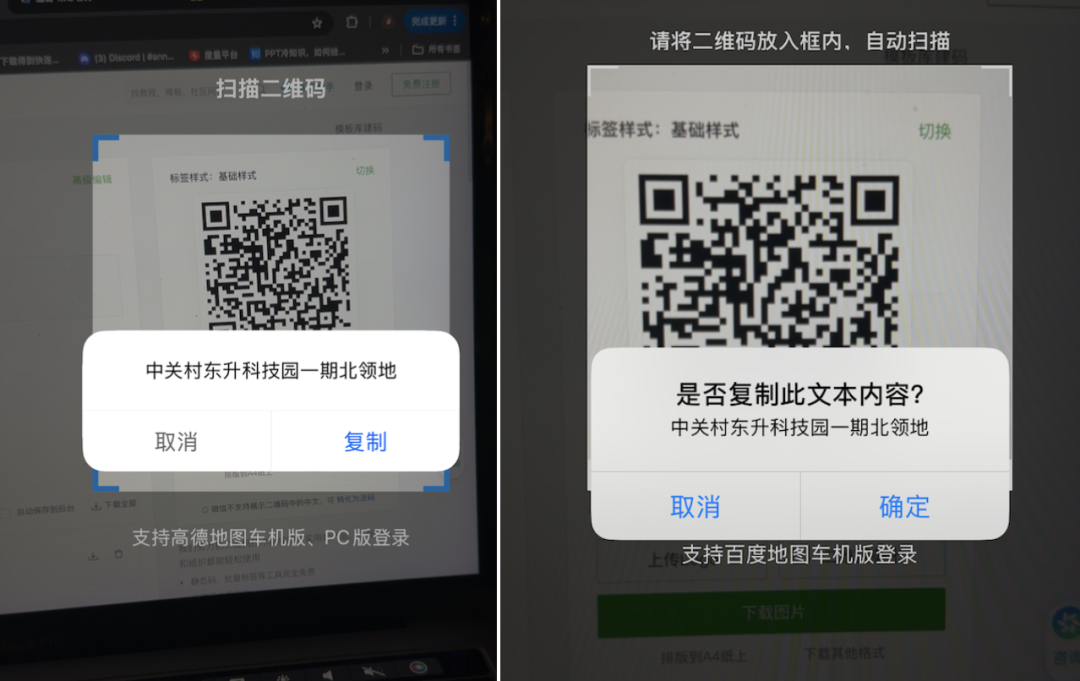 当然如果不想2个二维码干扰扫码交互,也可以只用纯文字版生成的二维码(上图中下边那个)即可,只不过司机端多了一个复制动作而已。