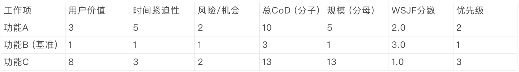 - 功能A:WSJF=2.0。价值很高(CoD=10),但规模也较大(5),导致单位收益略低。