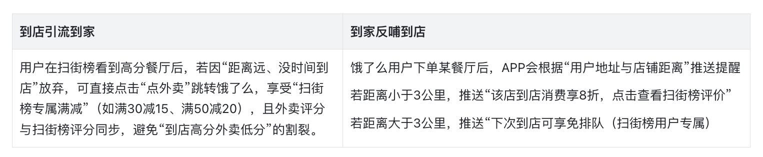 阿里将扫街榜与饿了么的联动视为“破局到店业务的关键一步”,通过“场景互补”打破“到店”与“到家”的界限,实现双向导流: