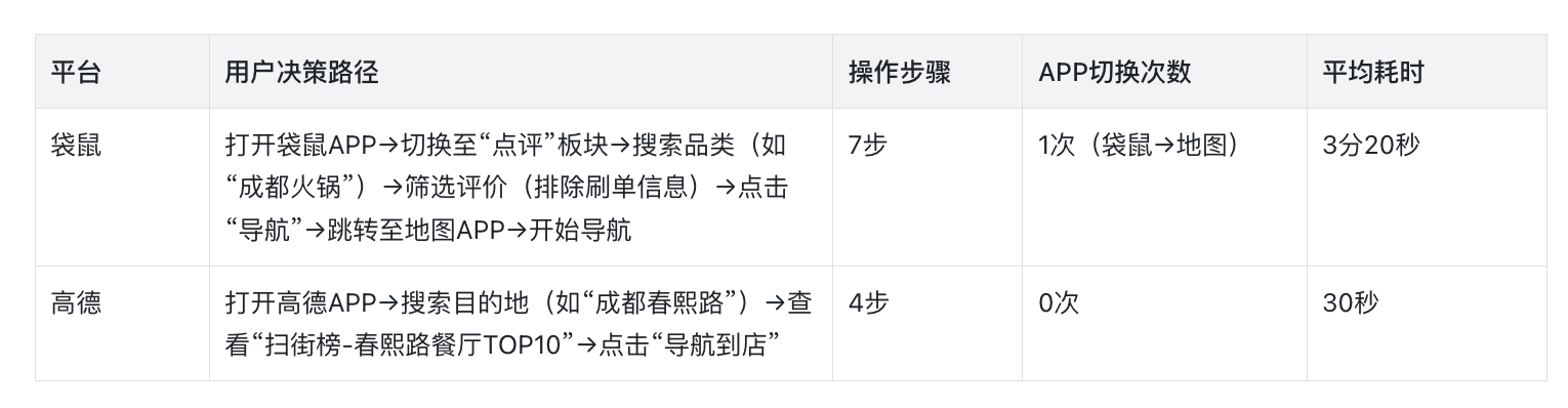 这种“出行即潜在消费”的场景属性,让高德成为阿里系唯一能承接“到店决策需求”的平台——用户打开高德的瞬间,就已暴露“去某地消费”的潜在意图,而「扫街榜」则精准承接了这一需求,构建了“无跳转、短路径”的消费闭环。对比袋鼠与高德的用户决策路径,差异一目了然: