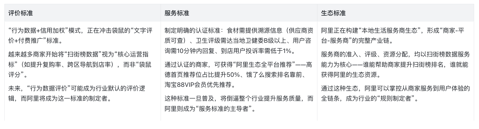 阿里的野心不止是“抢用户、抢商家”,更是要通过扫街榜制定“本地生活服务的新标准”,让行业从“袋鼠主导的流量玩法”转向“阿里主导的价值玩法”,最终掌控行业话语权: