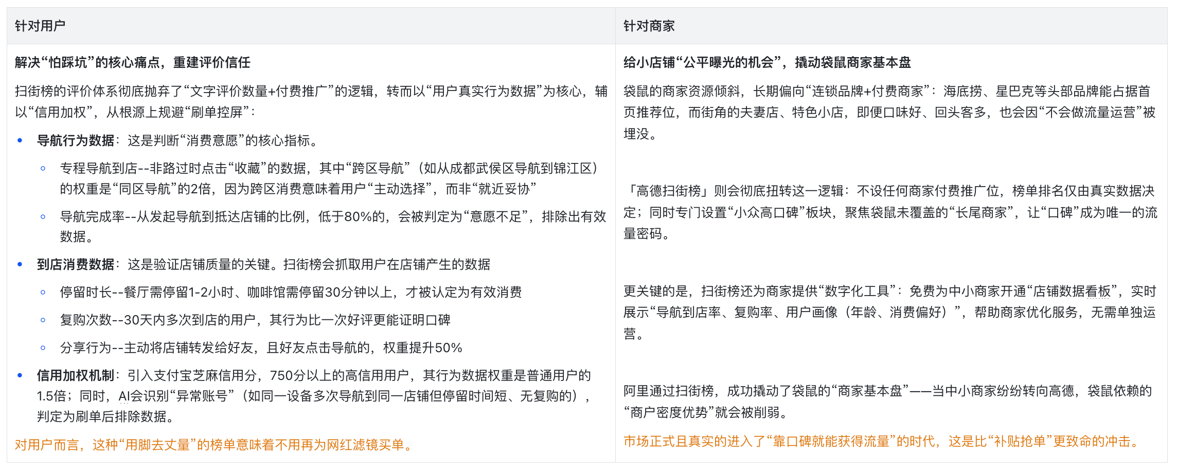 「高德扫街榜」的破局思路,正是用“去商业化+真实行为数据”重构评价体系,同时精准吸引被袋鼠“挤压”的两类核心群体——追求真实体验的用户,与渴望公平曝光的中小商家。