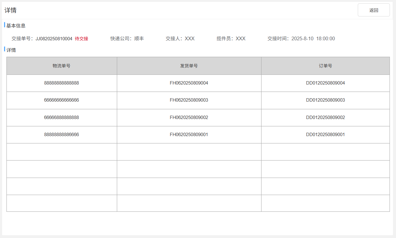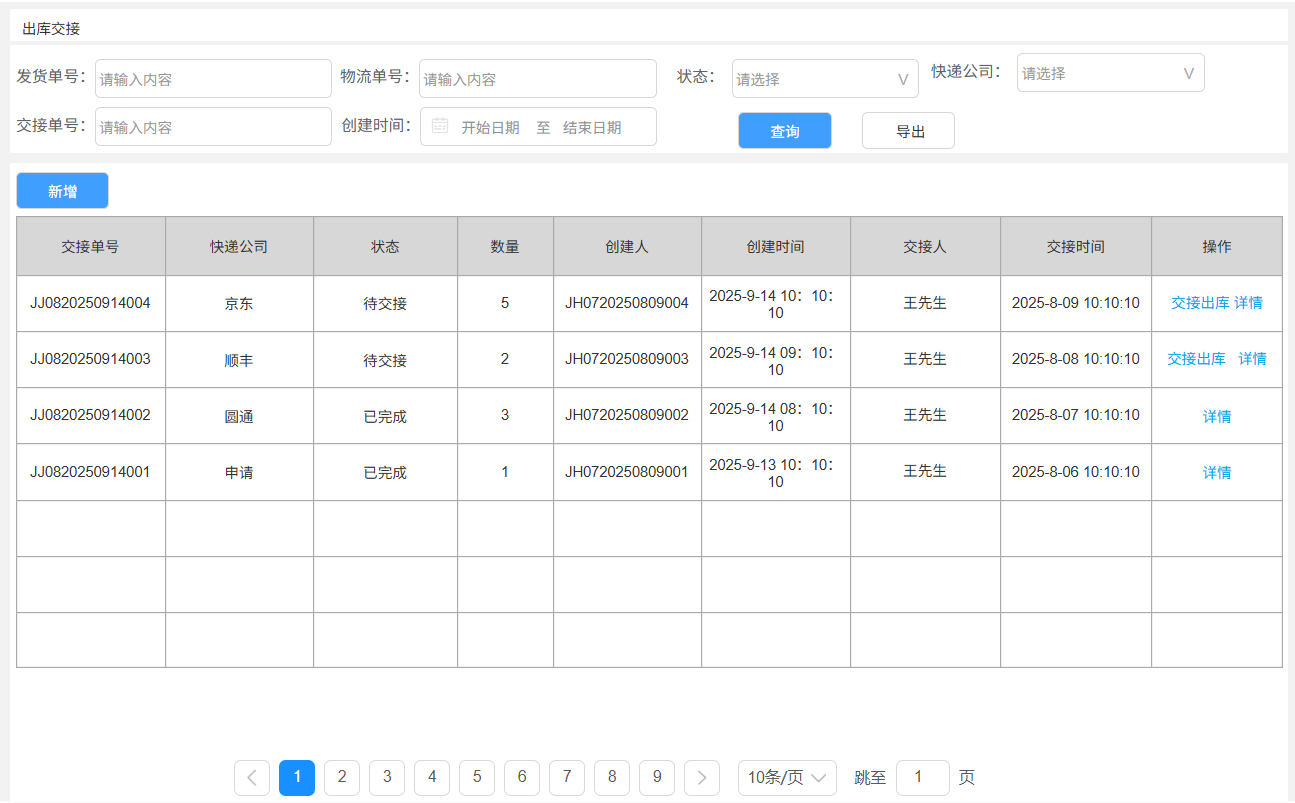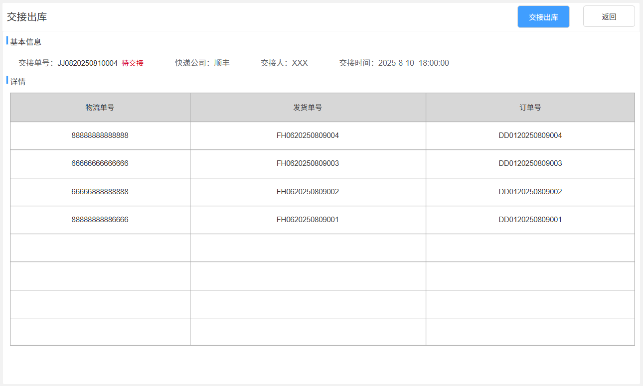 交接单号:生成规则:JJ+08+年月日+三位流水号,如JJ0820250914001。