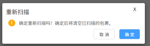 5、重新扫描:点击后弹出二次确认提醒“确定重新扫描吗?确定后将清空已扫描的包裹”,确定后清空已扫描的数据。