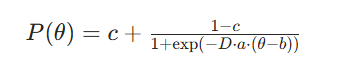 - 定义c为学生完全不具备该知识点能力时(θ→-∞),仍能答对题目的概率(即猜测概率)。