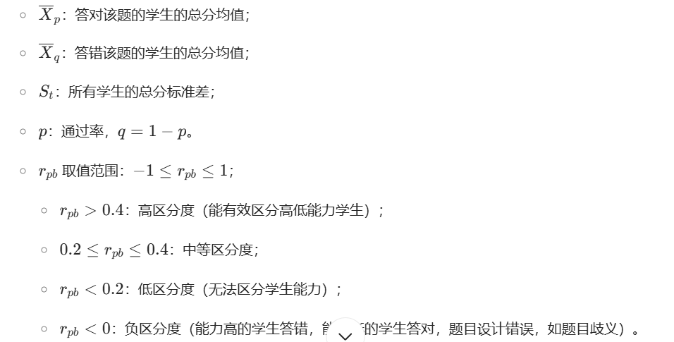 最常用 “点双列相关系数r(pb)”:通过计算 “学生在该题的得分(0/1)” 与 “学生的测试总分(代表整体能力)” 的相关性,判断题目能否区分能力: