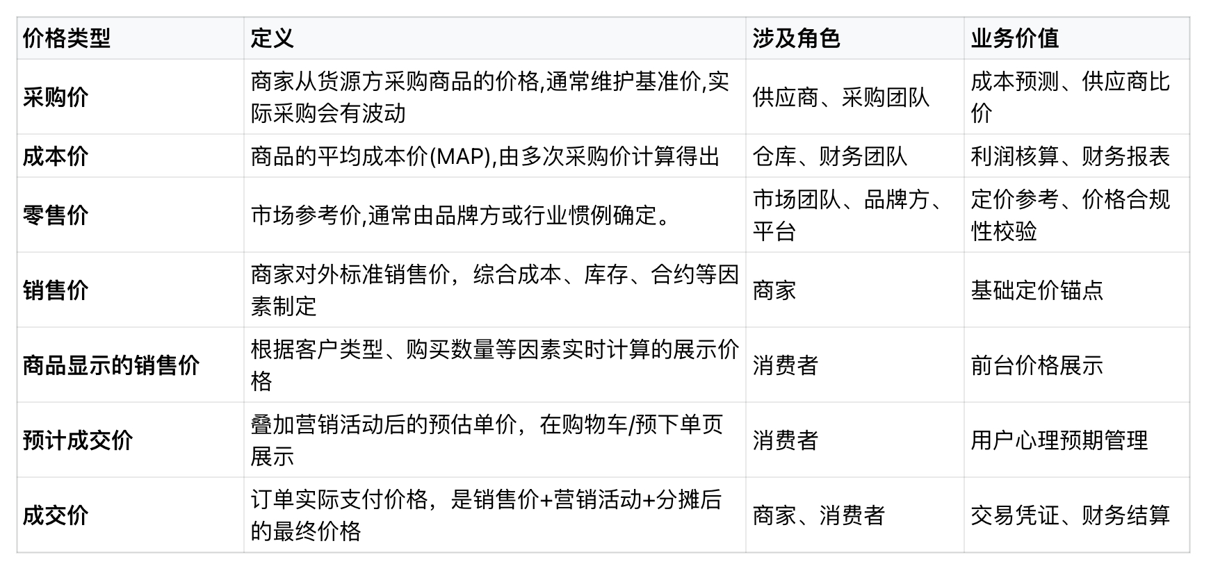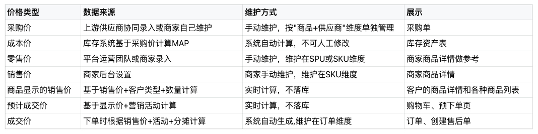 不同价格类型的维护方式与系统交互逻辑差异显著,需明确各价格的数据来源、变更规则与上下游依赖。