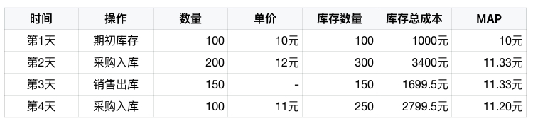 - 公式:MAP=(原有库存成本+新采购成本)/总库存数量