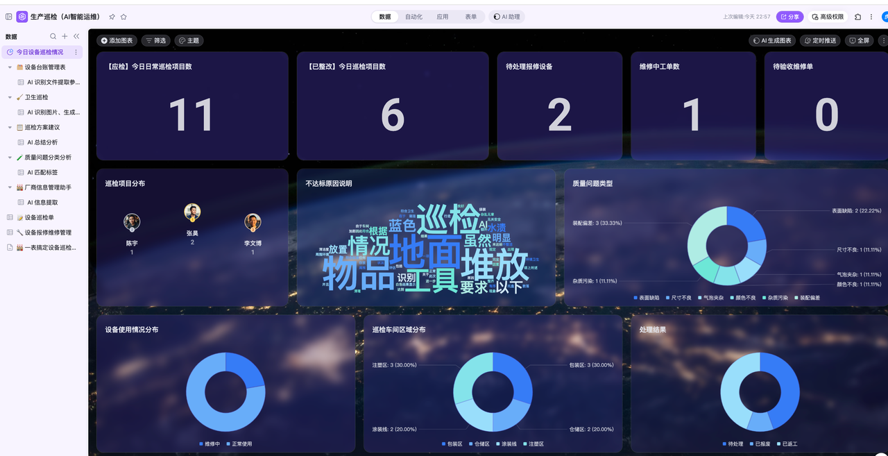 使用钉钉 AI 表格后,情况得到了极大的改善。员工只需将相关的统计数据导入钉钉 AI 表格中,然后通过自然语言向 AI 表格助理下达指令,例如:“计算每个月不同设备的设备使用情况、损坏情况和维修次数,并生成图表进行对比分析”。AI 表格助理接收到指令后,能够迅速理解需求,自动识别和处理表格中的数据。它会在瞬间完成复杂的计算工作,不仅准确地计算出每个月不同设备的定义数值,还会根据这些数据自动生成直观清晰的图表,如柱状图、折线图等,以便员工更直观地进行数据分析。