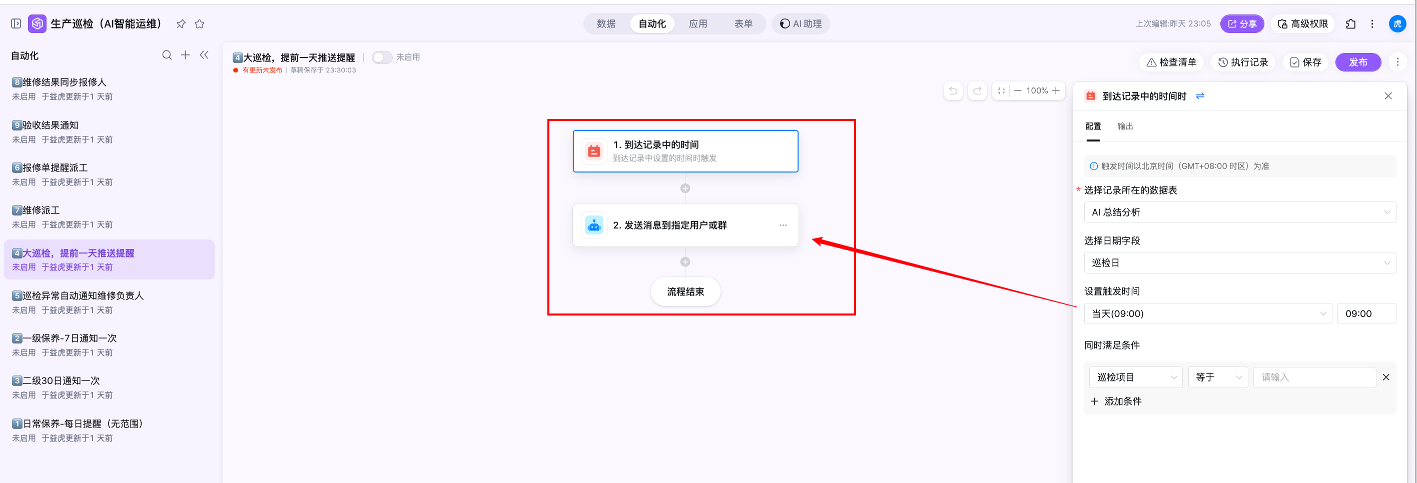 钉钉AI表格还提供与业务场景关联的功能,比如节点提醒。用户只需要在对应的节点设定好条件,满足触发条件即可以实现机器人自动通知(再也不用担心,下班忘记打卡了,机器人会一直提醒我)。