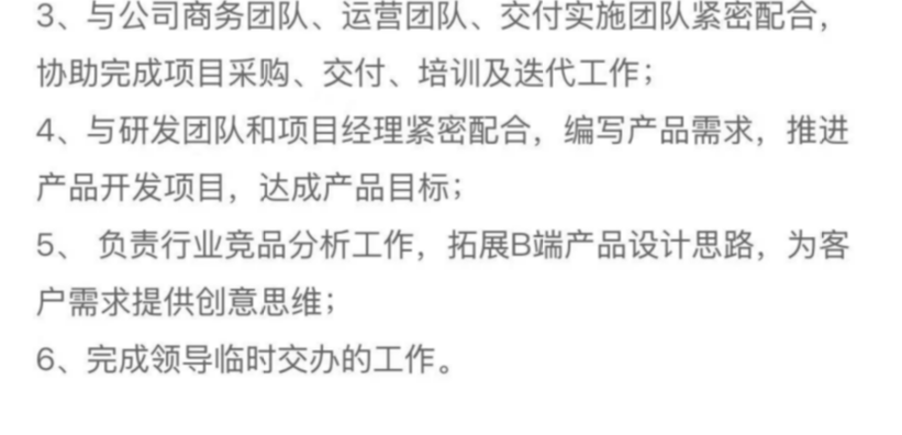 首先我们可以查看该公司的招聘JD,通过JD就可以初步了解公司的岗位要求,模板式的要求比如:擅长需求收集、原型设计、项目把控这些基础信息暂且不提,要求中总会有1~2条关于公司的特殊要求,针对要求我们可以给出针对我们自身相符合(稍微符合即可)的关键点,用数据体现自己的价值,突出hr对你的印象点。当然现在大环境下公司一般会招聘拿来即用的产品经理,这就很考验产品经历的自己能力和项目经验。
