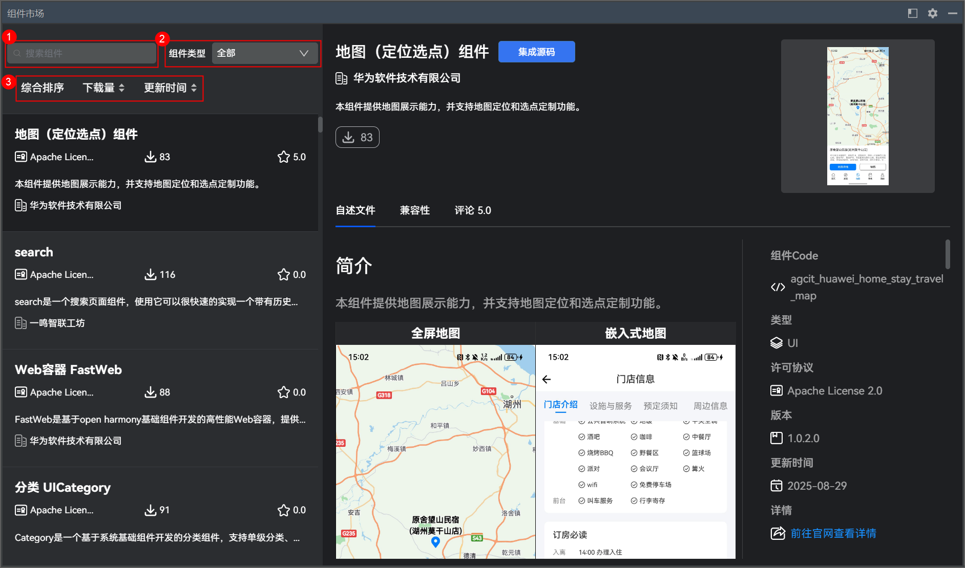 - 在组件市场界面,您可以通过左上角①搜索框输入关键词,快速查找所需的组件。