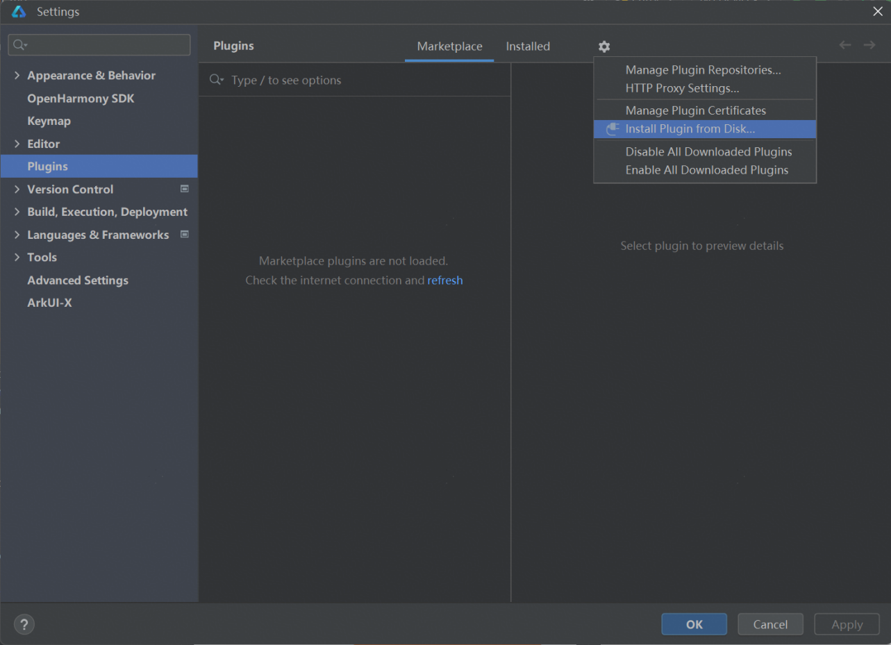在插件市场界面,点击右上角的“齿轮图标”图标,选择“Install Plugin from Disk…”(从磁盘安装插件)。