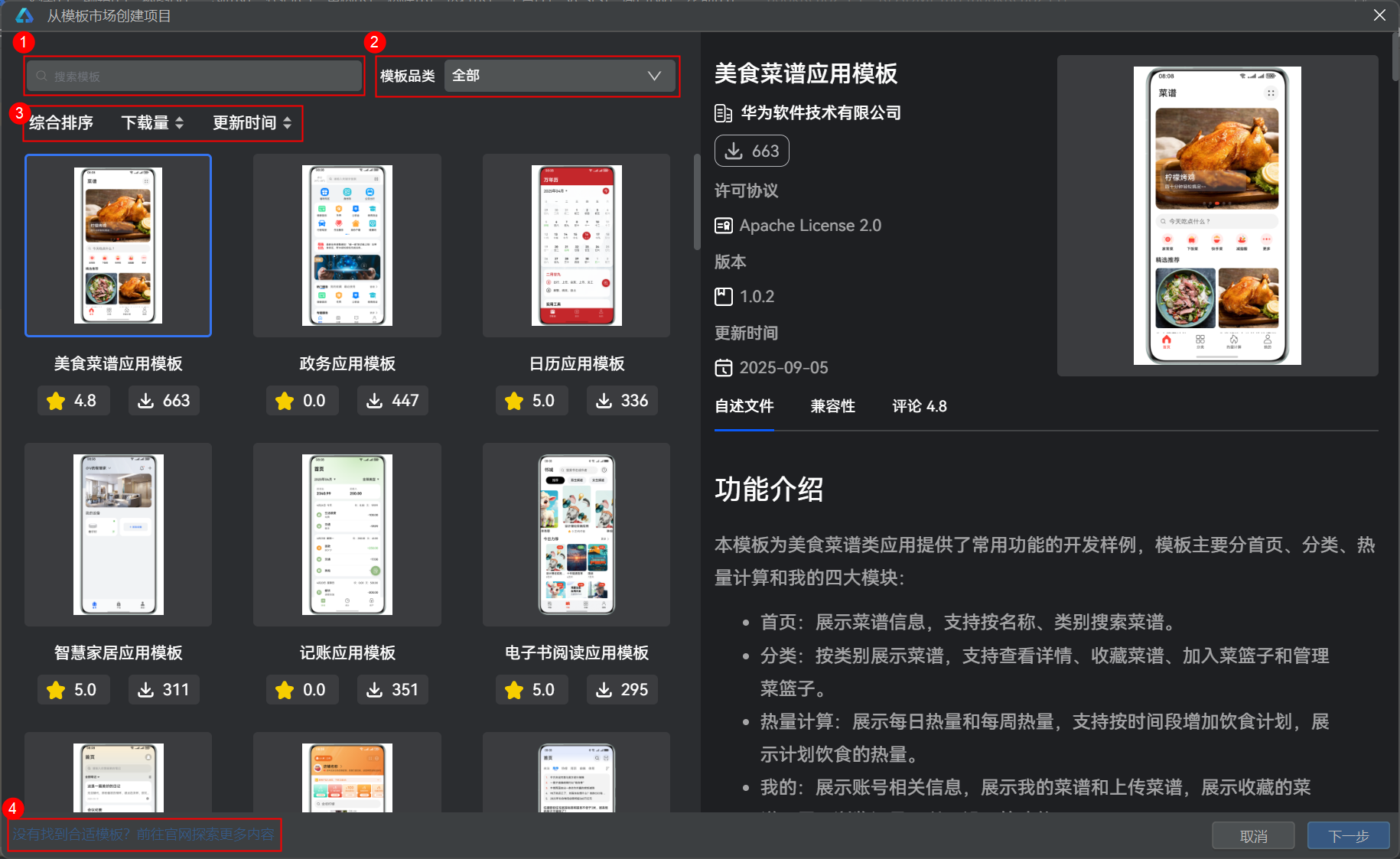 - 在模板市场界面,您可以通过左上角①搜索框输入关键词,快速查找所需的模板。