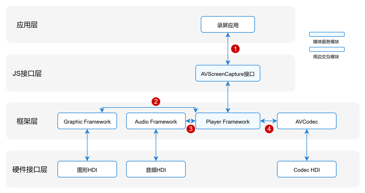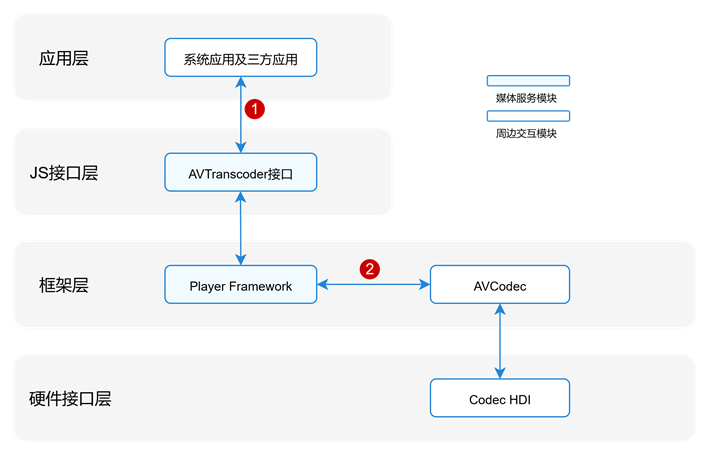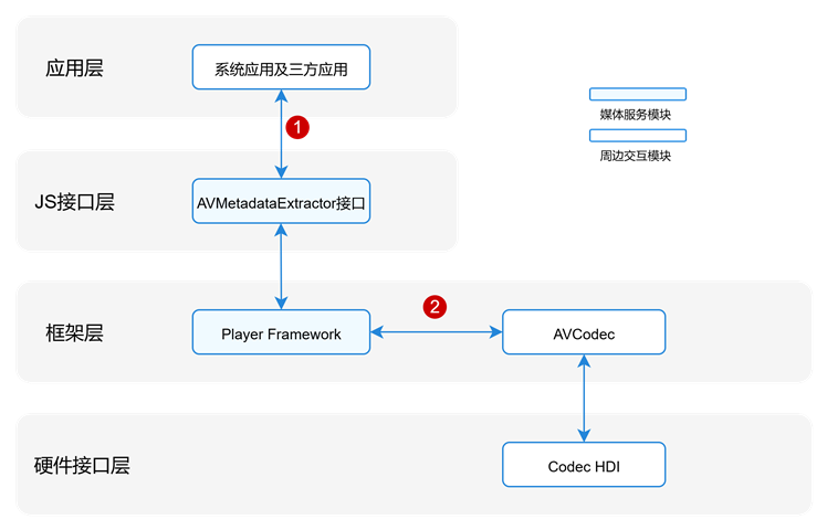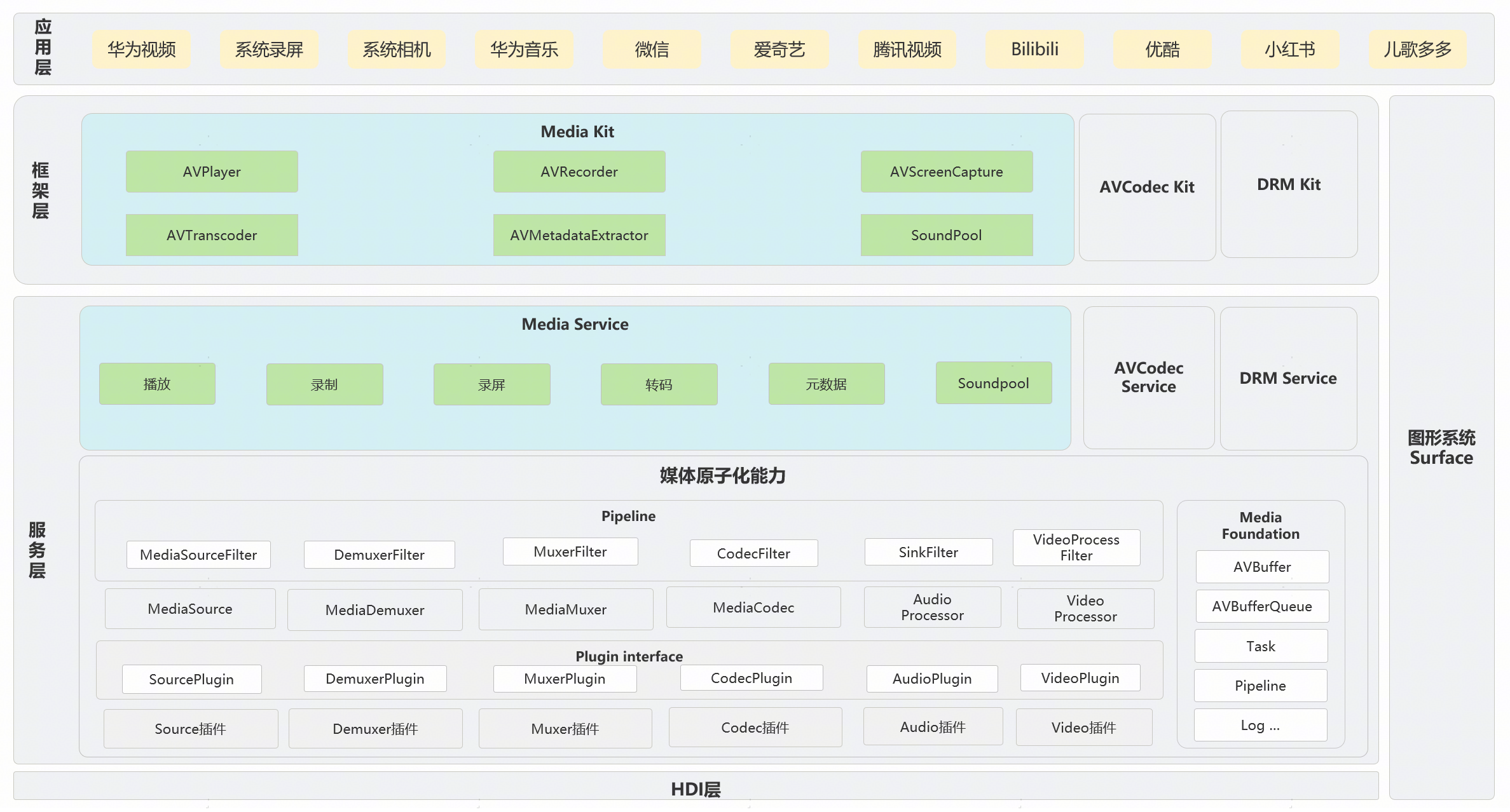 Media Kit 让开发者可以调用系统的音视频能力,涵盖播放、录制、录屏、元数据提取与转码六大核心功能模块,支撑系统应用与第三方应用在视频播放、内容创作、教学录屏、直播互动等典型场景下的音视频处理需求。系统框架和各核心功能模块介绍如下: