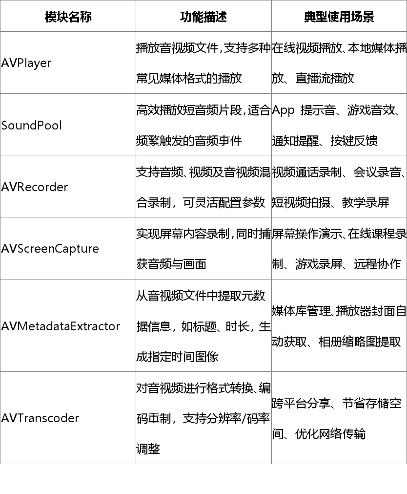 Media Kit 提供了一整套音视频开发工具链,无论你是开发音乐播放器、视频播放器、录音应用,还是屏幕录制工具,都能找到合适的组件来实现功能。